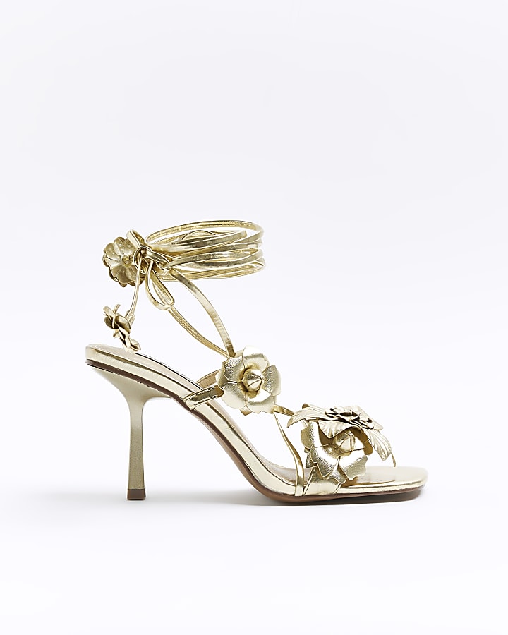 Gold flower tie up heeled sandals River Island