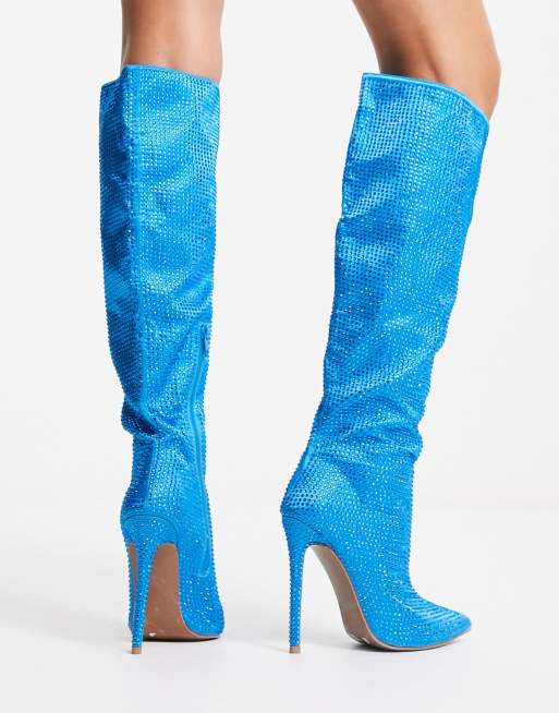 ASOS DESIGN Carly pull on knee boots in blue rhinestone