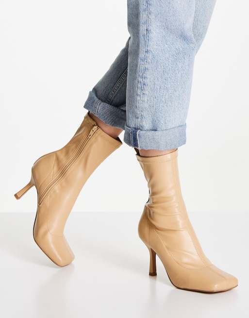 Nude clearance sock heels, ASOS DESIGN Roma square toe heeled sock boots in camel clearance