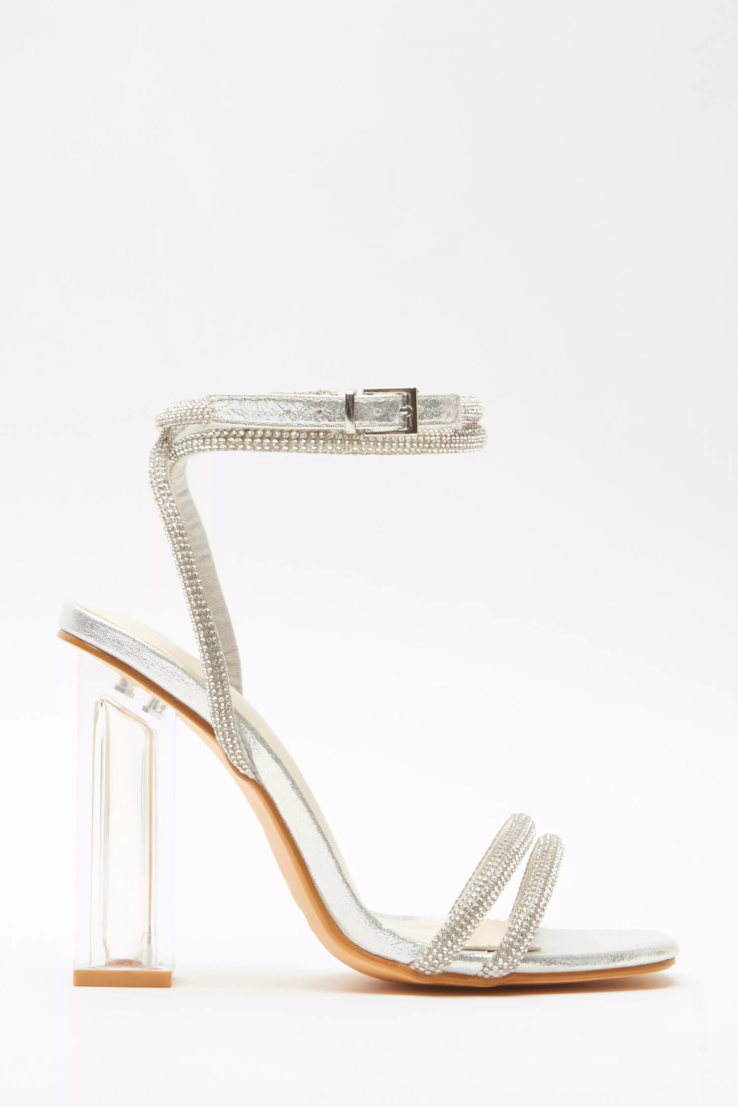 Wide Fit Silver Diamante Clear Heeled Sandals
