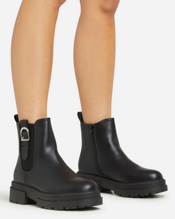 Black chunky faux clearance leather boot, Perthy Chunky Sole Buckle Detail Ankle Chelsea Boot In Black Faux clearance