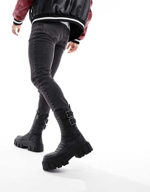 ASOS DESIGN chunky boots in black faux leather with padding and buckle details
