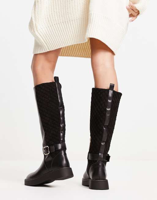 River Island quilted buckle high leg boot in black ASOS