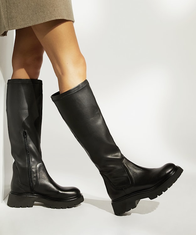 Tilt Black Elasticated Leather Knee High Boots Dune London