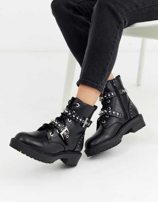 Wide Fit Black Studded Chunky Biker Boots New Look