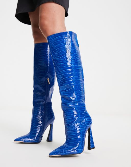 Simmi London Ravi flare heel knee boots in cobalt blue croc