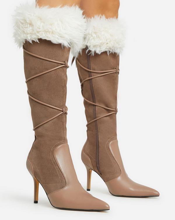 Boots with fur clearance trim, Blazer Lace Up Faux Fur Trim Detail Pointed Toe Stiletto Heel Knee clearance