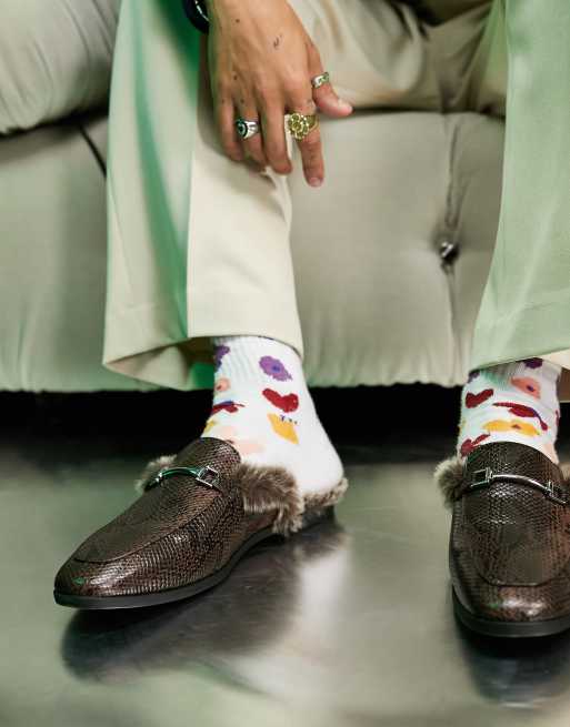 Asos clearance mule loafers, ASOS DESIGN backless mule loafers in brown snake faux leather with faux fur clearance