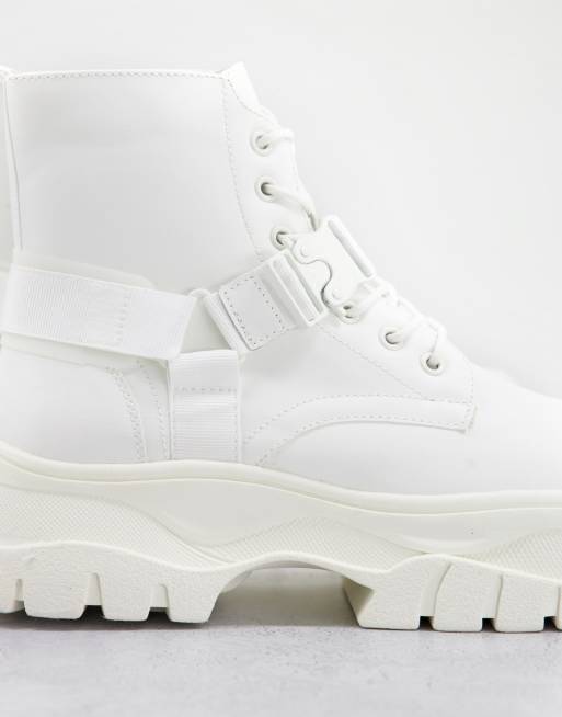 ASOS DESIGN lace up boots in white faux leather with strap detail on chunky sole