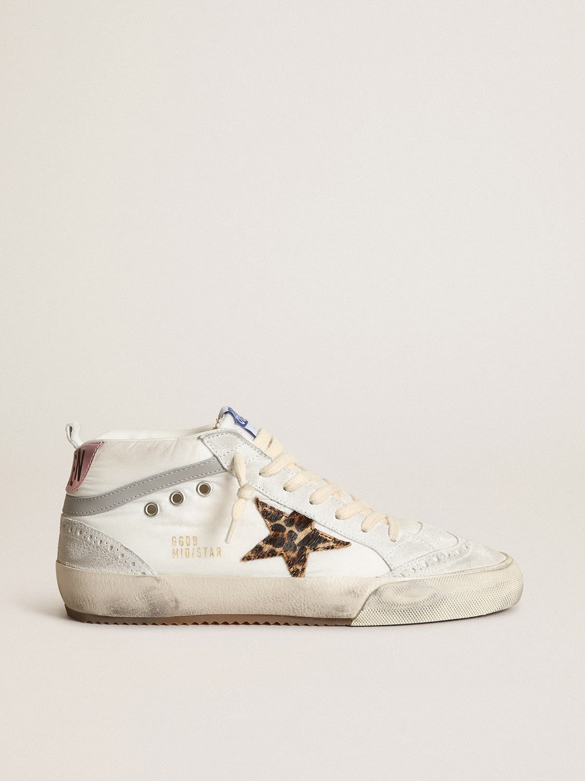 Women s Mid Star LTD in white nylon with leopard print pony skin star