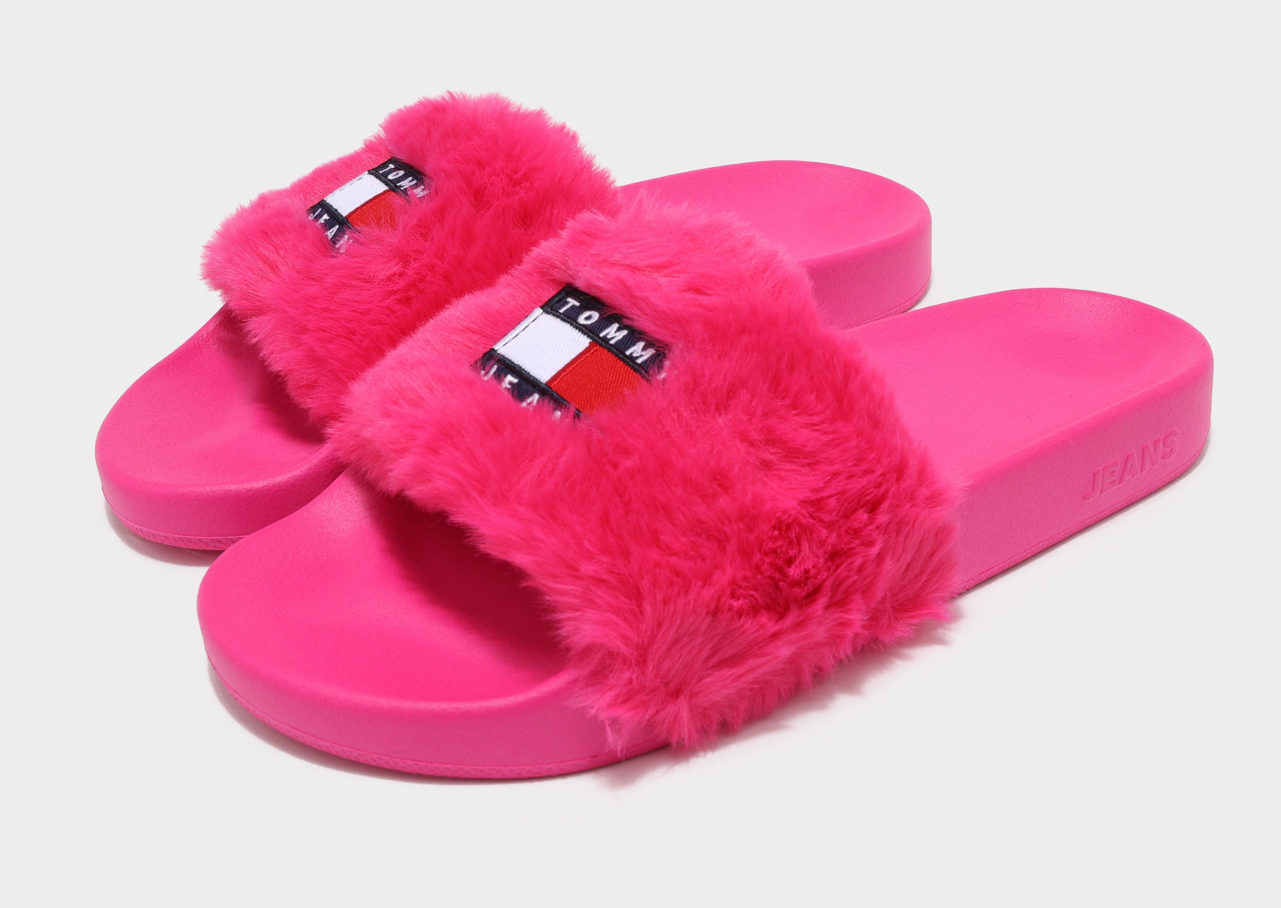 Tommy clearance fur slides, Buy Tommy Hilfiger Logo Tape Faux Fur Slippers In Black clearance