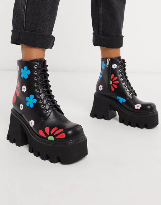 Koi Footwear Floral Print Lace Up Combat Boots Black