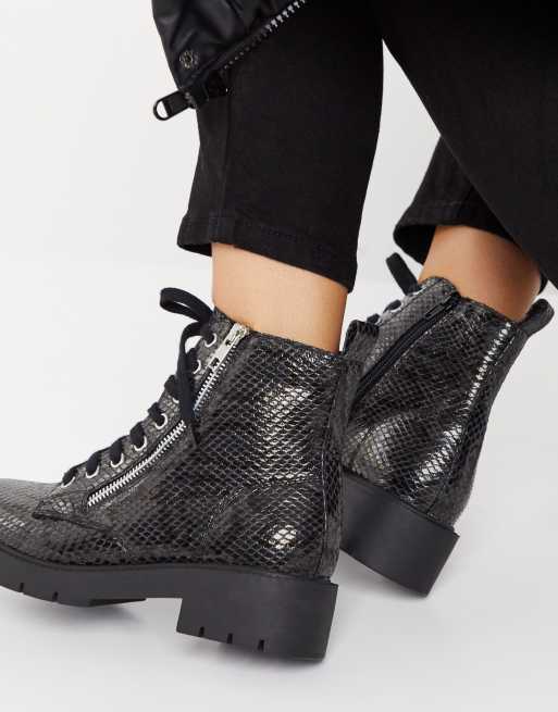 New Look faux snake lace up flat chunky boot in black