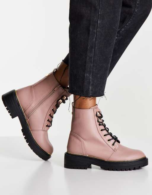 Pink Leather Look Zip Trim Lace Up Chunky Boots New Look