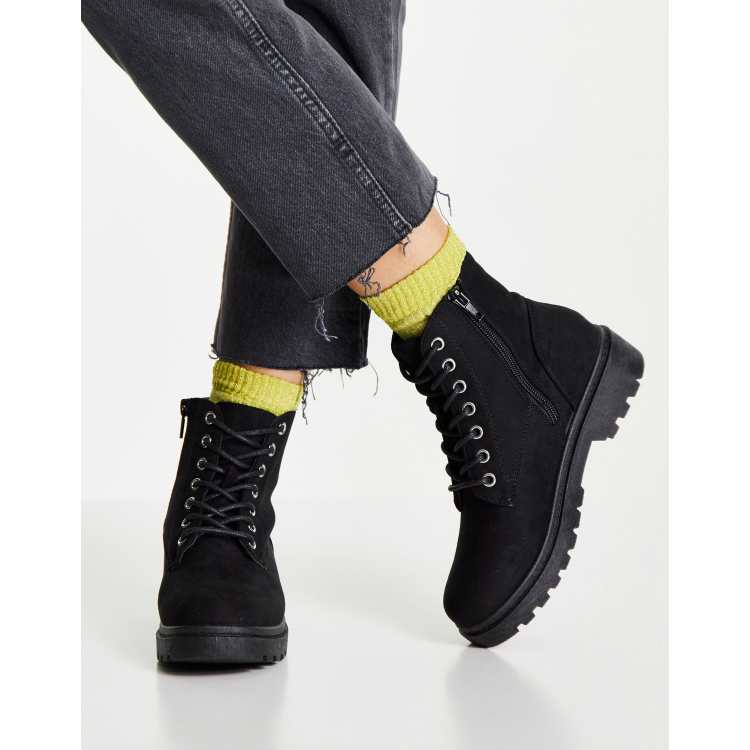 New Look Wide Fit zip detail lace up flat boots in black ASOS