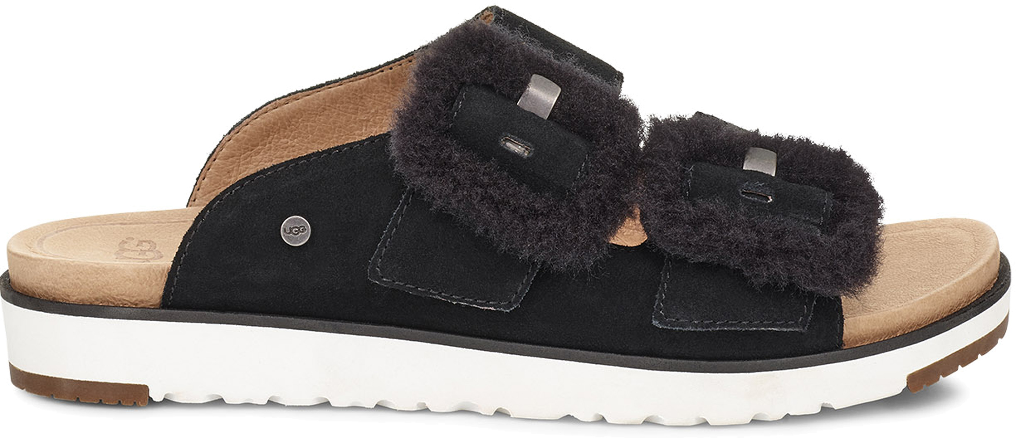 UGG FLUFF INDIO BLACK SUEDE SLIDE SLIP ON BUCKLE SANDALS SIZE 5.5