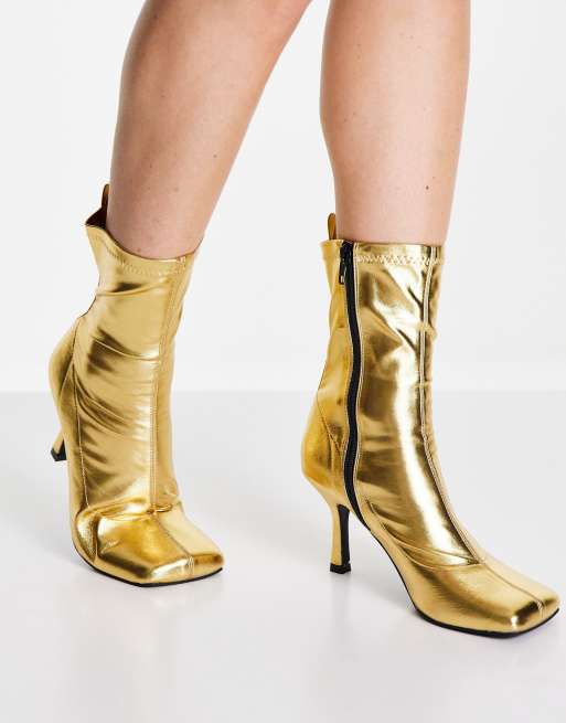 ASOS DESIGN Roma square toe heeled sock boots in gold