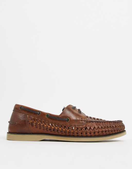 ASOS DESIGN Wide Fit woven boat shoes in tan leather with gum sole