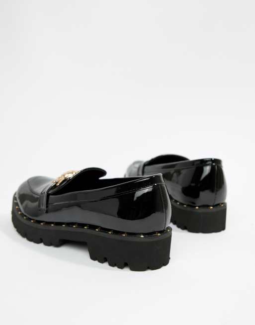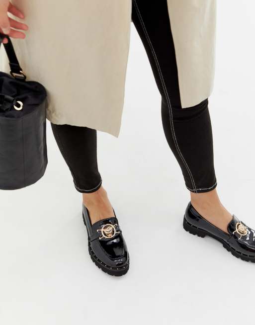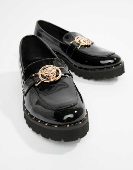 Glamorous black chunky flat clearance shoes with gold lion trim
