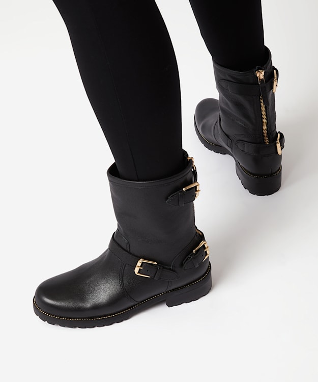Dune ladies biker clearance boots, Head Over Heels by Dune Raakel Black Multi Buckle Biker Flat Calf Boots clearance
