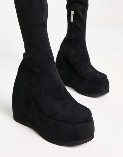 Black Leather Look Stretch Wedge Heel High Leg Boots New Look