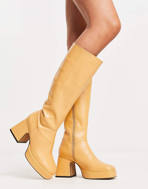 Topshop Holly premium leather platform knee high boot in camel ASOS