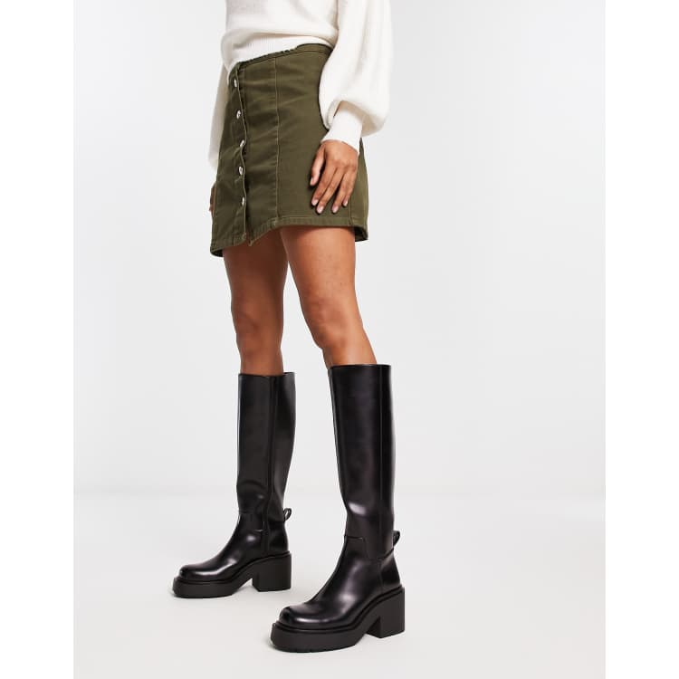 Monki vegan leather heeled platform knee high boots in black ASOS