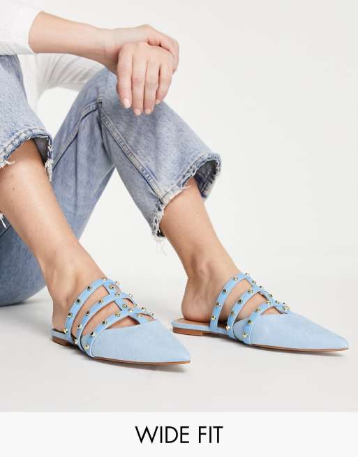 ASOS DESIGN Wide Fit Liquorish studded flat mules in blue