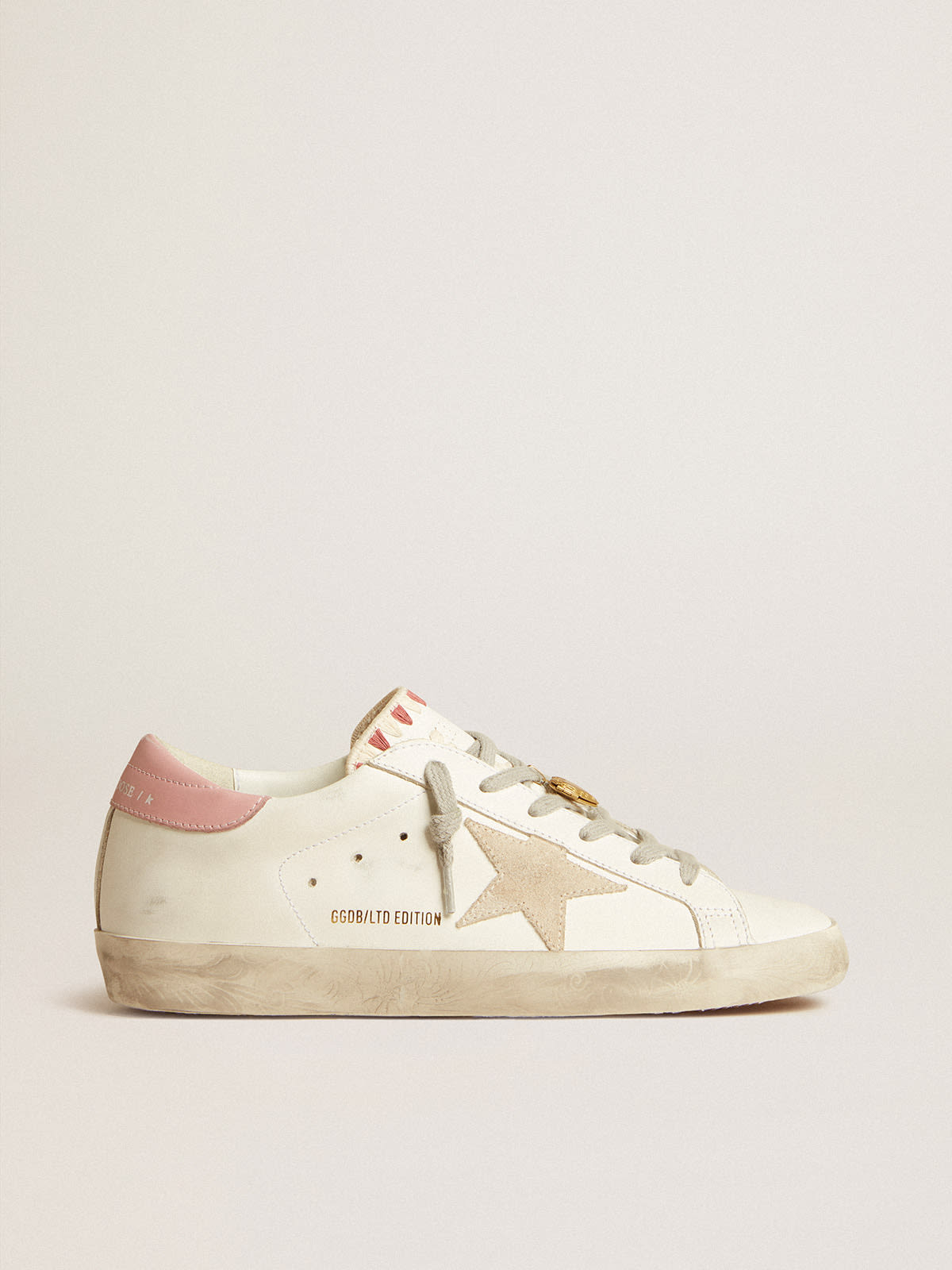 Super Star sneakers in white leather and canvas with shocking pink leather star and silver glitter heel tab