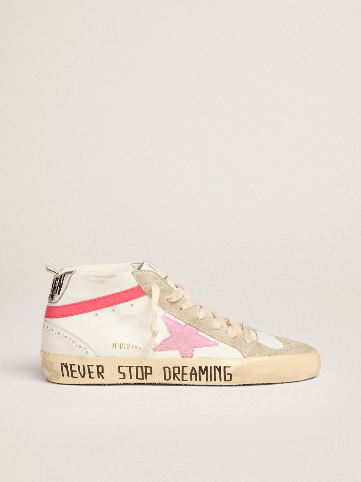 Pink high top clearance golden goose, Mid Star sneakers in white leather with pink star and black lettering clearance