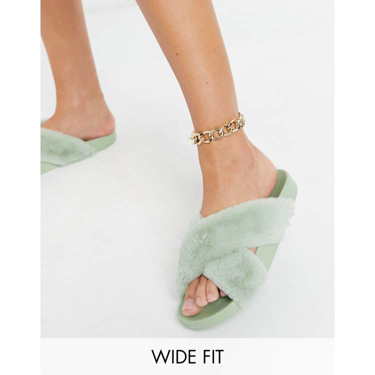 ASOS DESIGN Wide Fit Fiona fluffy crossover sliders in sage green