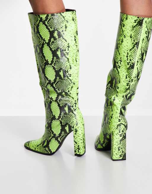 Public Desire Posie heel knee boots in lime snake print ASOS