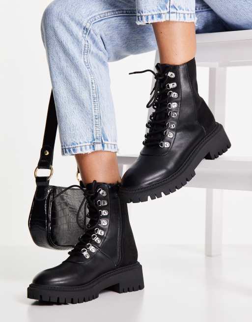 London Rebel Wide Fit chunky flatform hiker boots in black ASOS