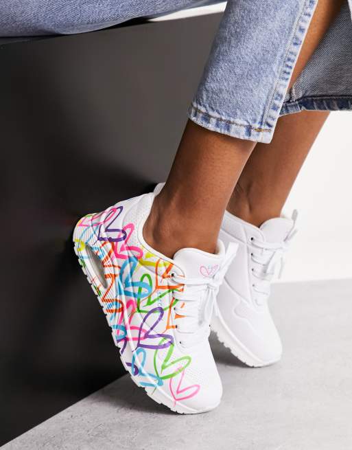 Skechers shoes with clearance flowers, Skechers Uno sneakers with neon graffiti heart print in white clearance
