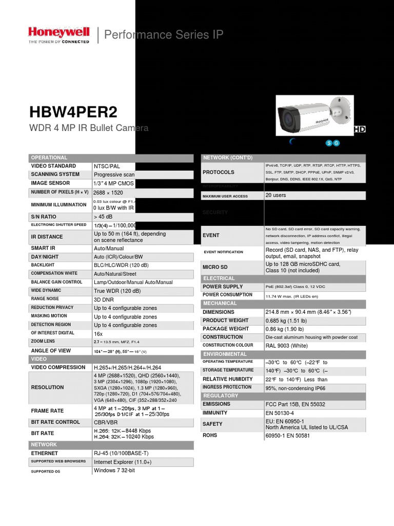 Honeywell Security HBW4PER2 IP camera Specifications Honeywell