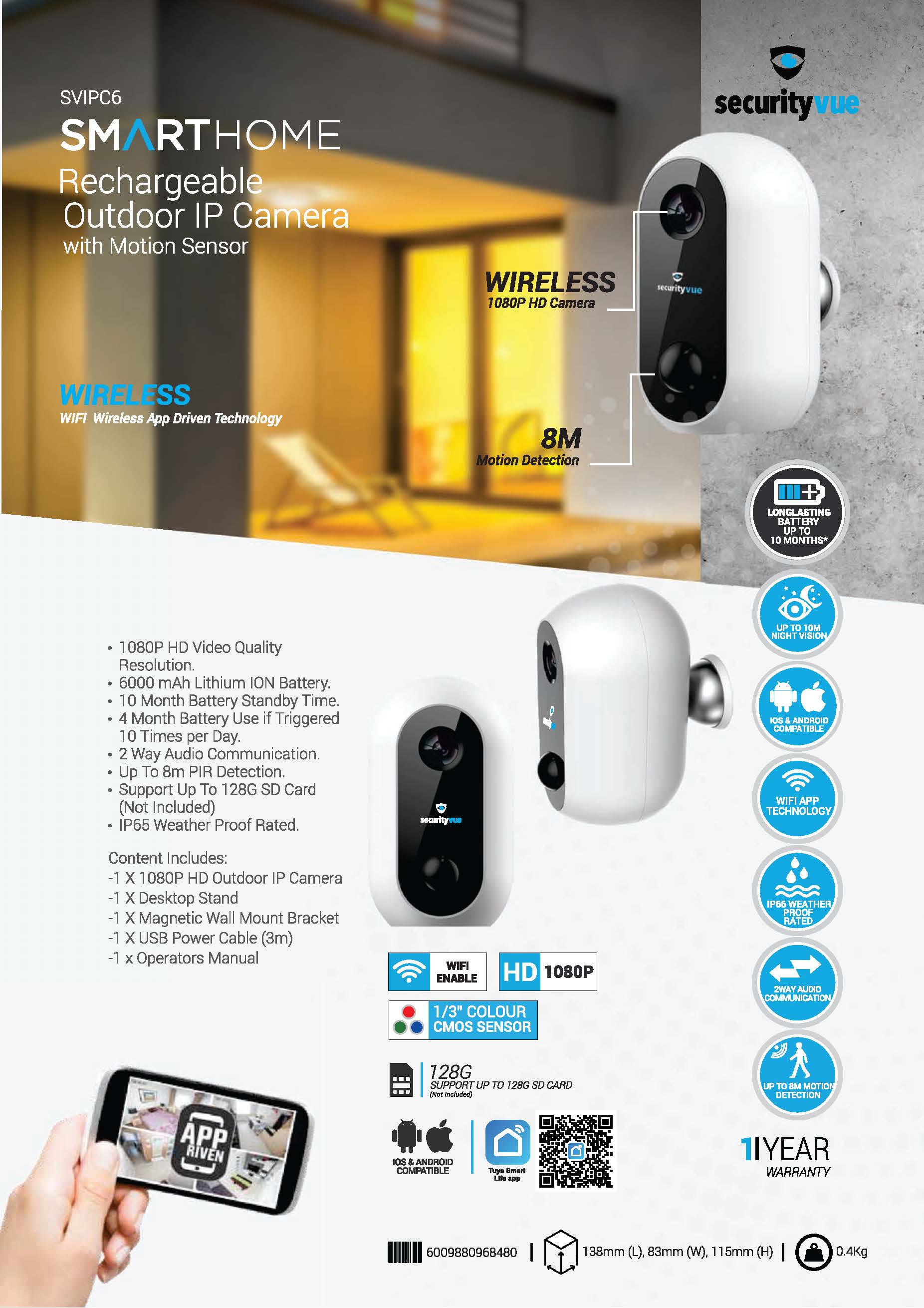 SVIPC6 Securityvue Smart Home Rechargeable Outdoor IP Camera with