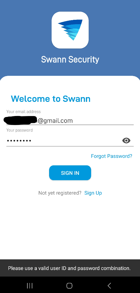 Swann Security app Please use a valid user ID and password