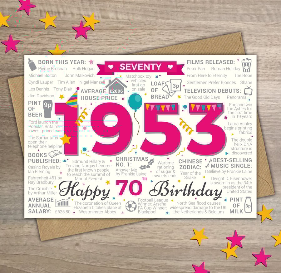 Happy 70th Birthday WOMENS FEMALE SEVENTY Card Born In 1953 Birth Year Facts