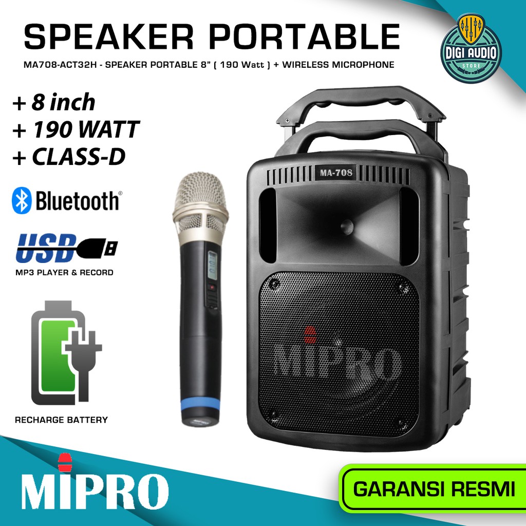 Speaker Portable Bluetooth 1 Mic Wireless Microphone 8 inch 190 Watt Batre Cas MIPRO MA 708 ACT 32H