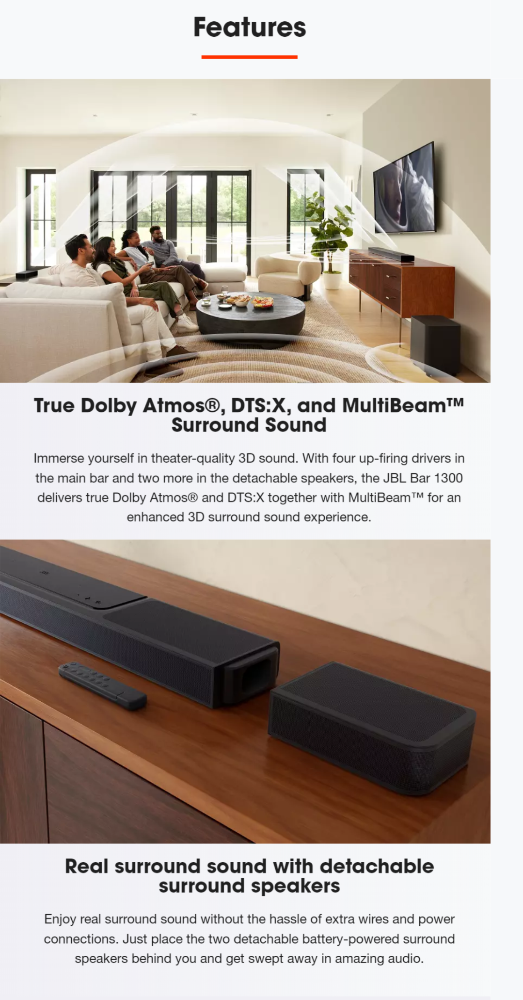Battery powered surround clearance sound, JBL BAR 1300 11.1.4 channel soundbar with detachable surround clearance