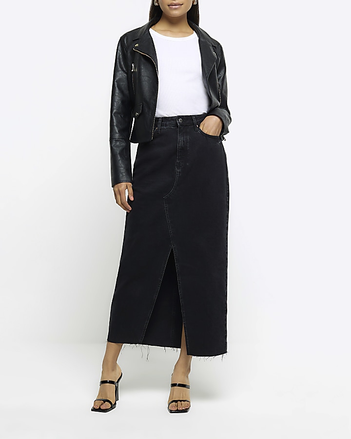 Black split front denim midi skirt
