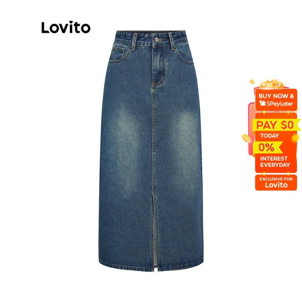 Lovito Women Casual Plain Washed Split Midi Denim Skirt L39AD079