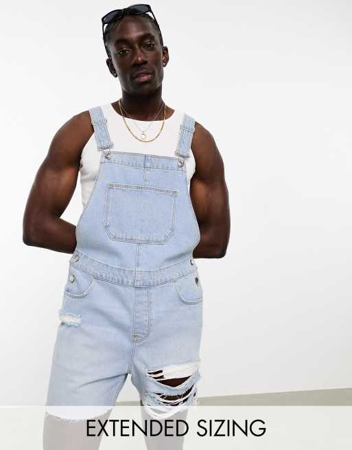 ASOS DESIGN dungaree in light wash blue with heavy rips in shorter