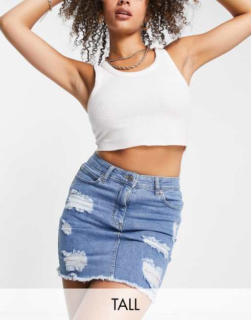 Parisian Tall distressed denim skirt in mid blue ASOS