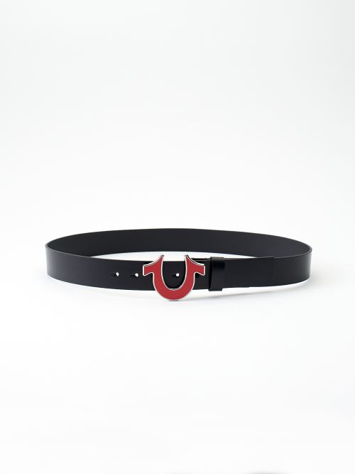 True Religion Mens Belt TR302845 Sage II Enamel Horseshoe Black Gold buckle