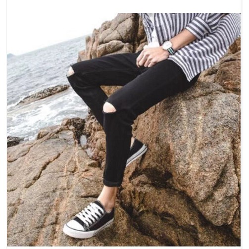Black skinny jeans with hole clearance in knee, Skinny Jeans Denim Pants Men Solid Black Jeans Men Ripped Beggar jean homme With Knee Hole For Men clearance