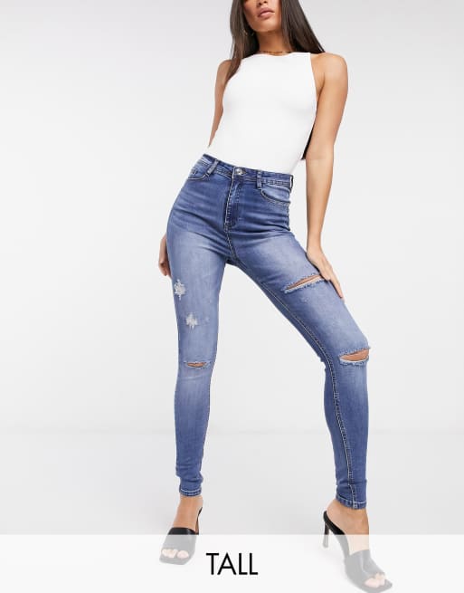 Missguided Tall high waist sinner skinny jean with rips in blue