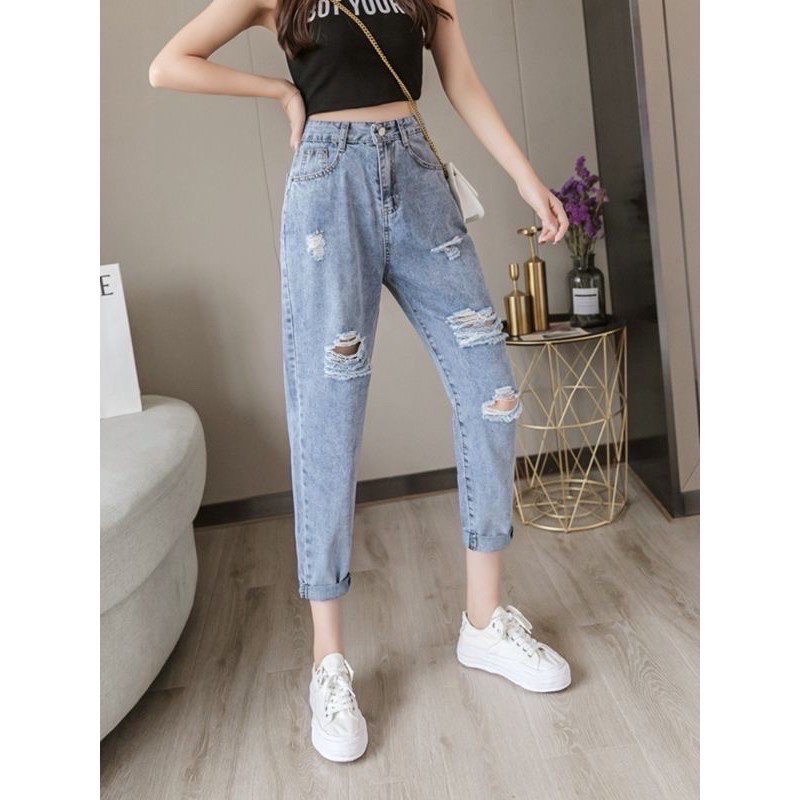 Blue Wide Ripped Holes Legs Straight Jeans Knee Cut Vintage Distressed Loose Fit Slash Pockets Denim Pants Women s Denim Jeans Clothing