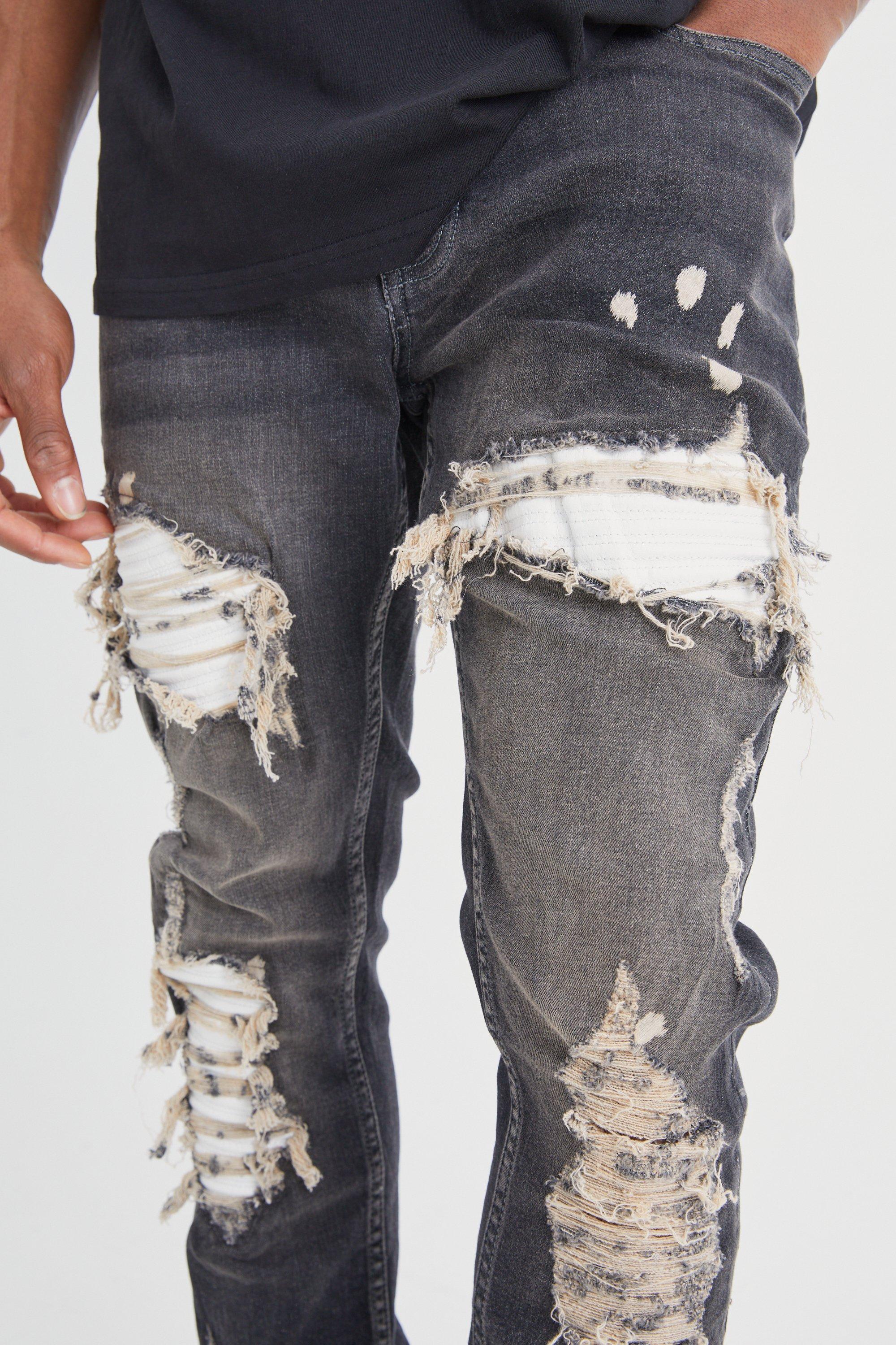 White clearance tattered jeans, Skinny Stretch Stacked White Pu Biker Rip Repair Jeans boohoo CA clearance