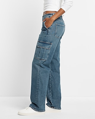 Low Rise Medium Wash Baggy Straight Cargo Jeans Express